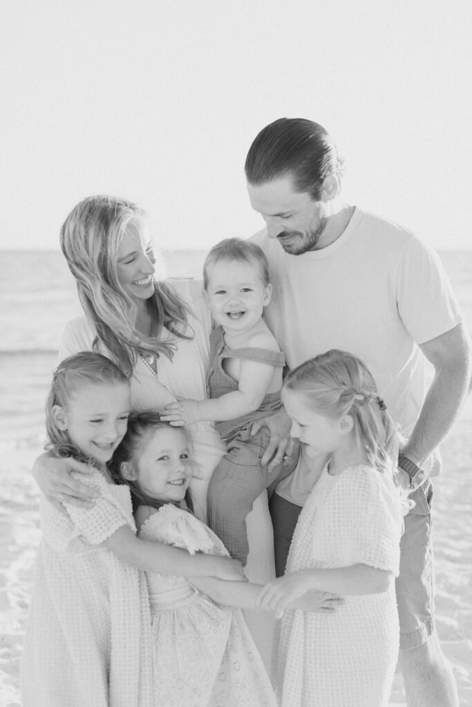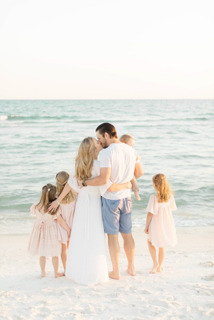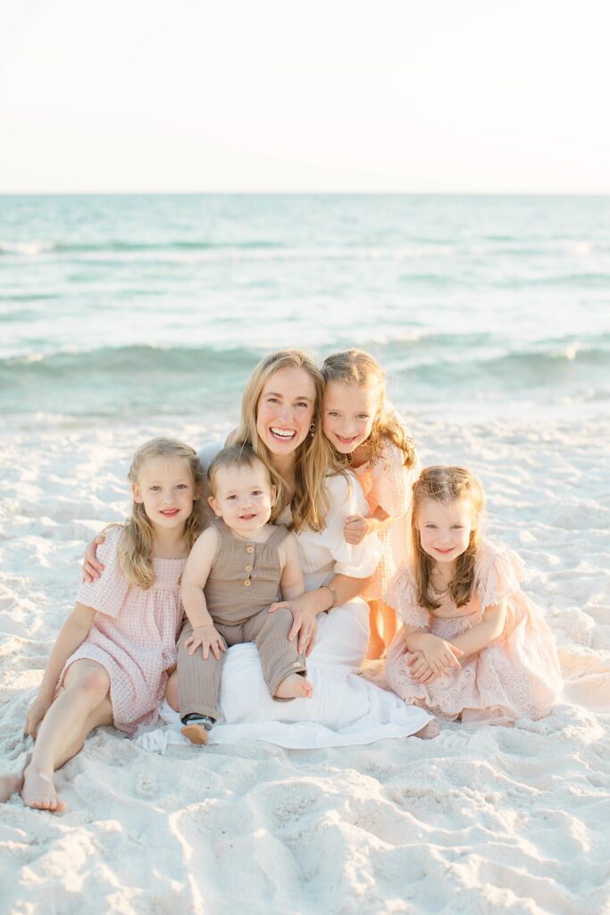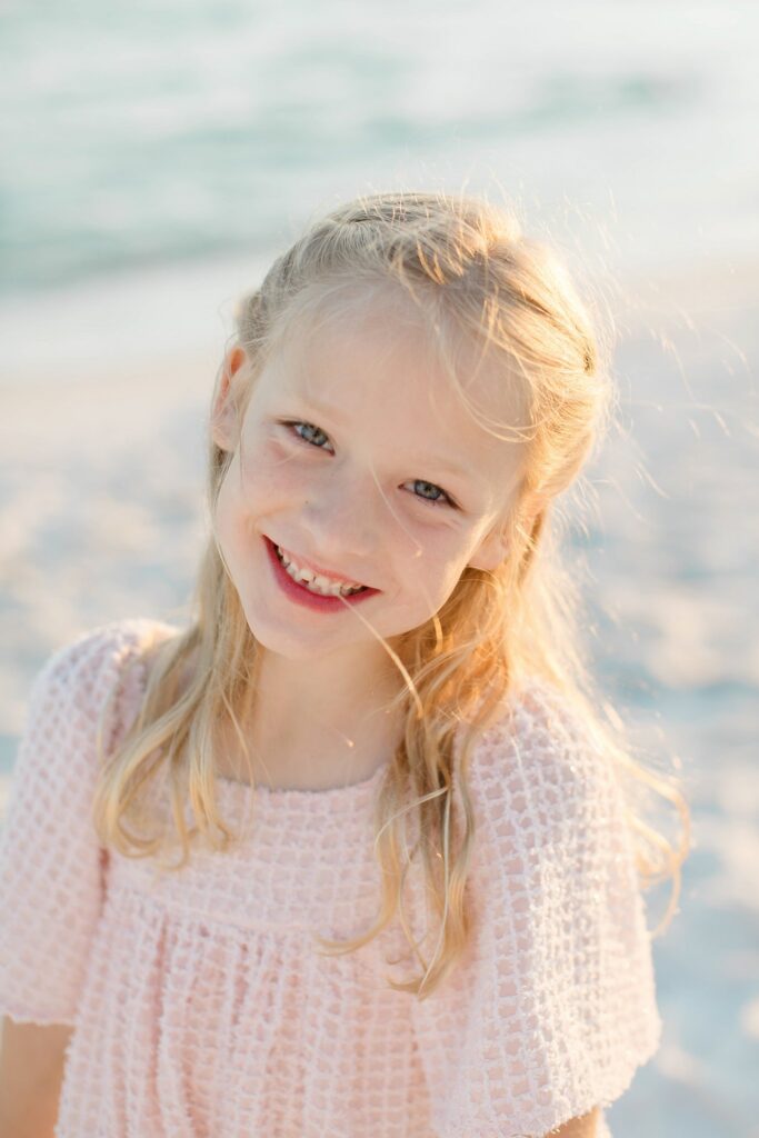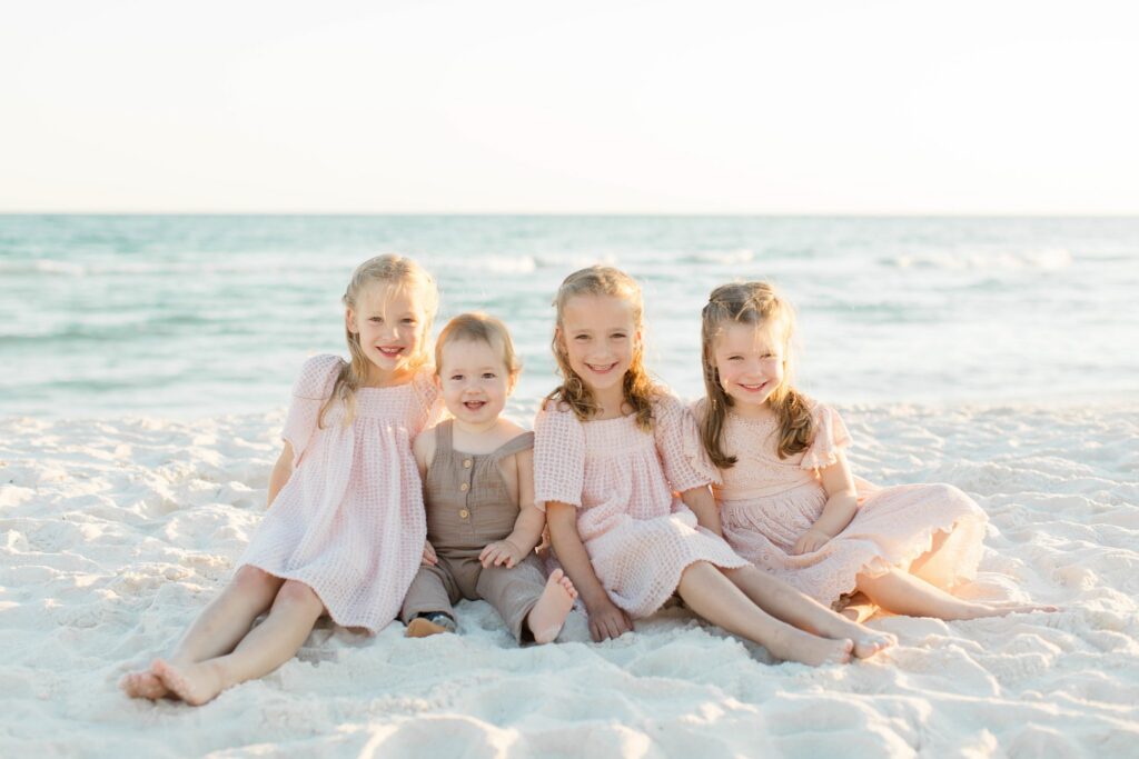 For this particular family, we were planning a new session to live alongside images from a session we photographed a couple years ago in Inlet Beach. In their previous portraits, their girls wore soft pink dresses with a palette centered around pinks and neutrals. Those images are already part of their home, so it was important that this new session felt connected without looking identical.
